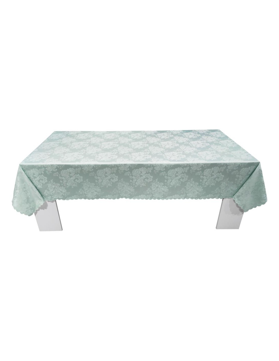 Tovaglia rettangolare da 12 posti in Fiandra di puro cotone fantasia floreale, rifinita con smerlo e tovaglioli.