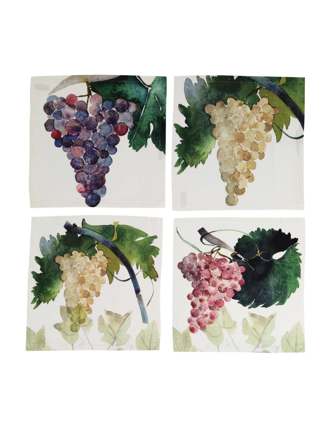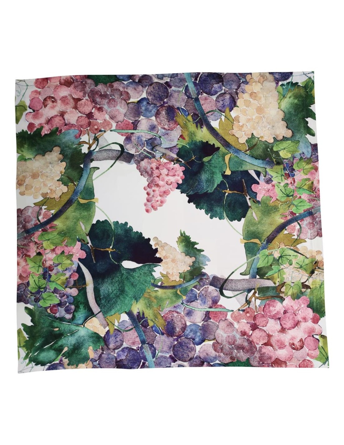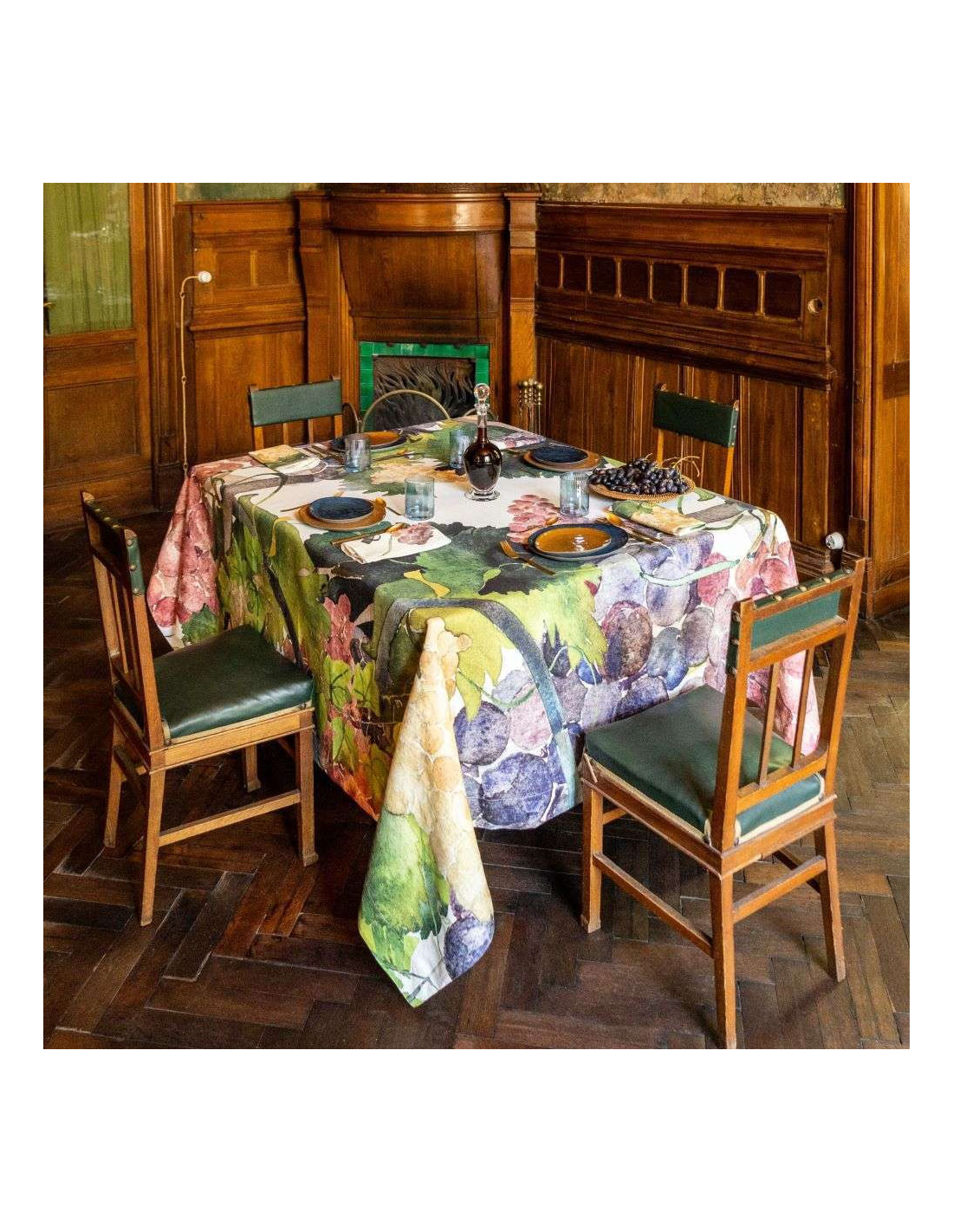 Tovaglia quadrata 8 posti adatta anche per i tavoli tondi in puro lino con pregiata stampa digitale fantasia Grappodi d'uva e tovaglioli.