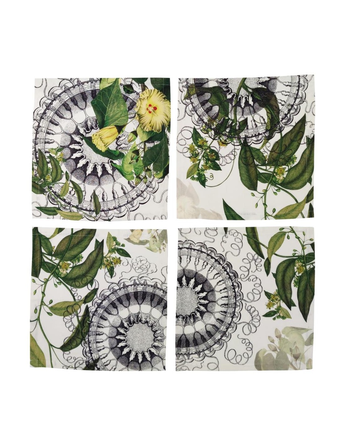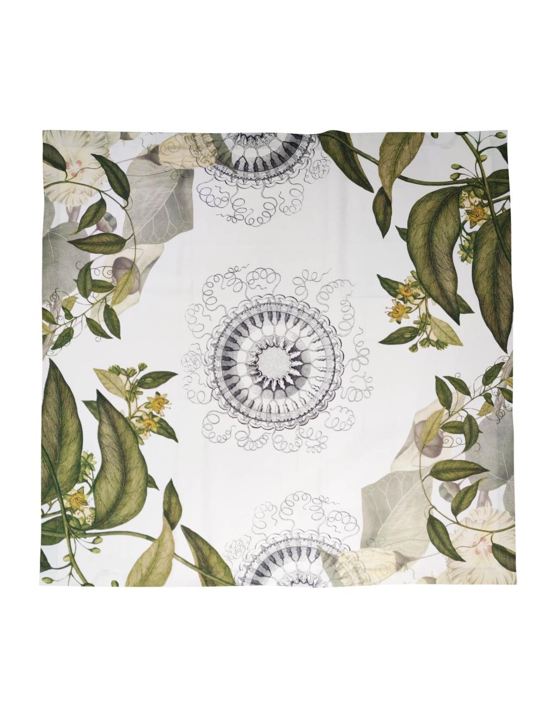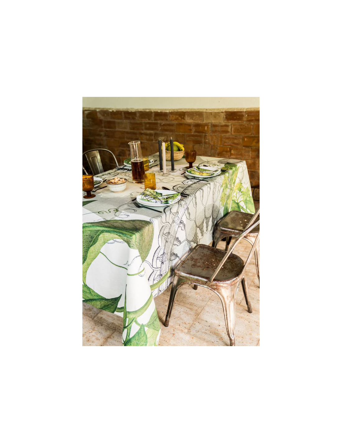 Tovaglia quadrata 8 posti adatta anche per i tavoli tondi in puro lino con pregiata stampa digitale fantasia foglie e tovaglioli.