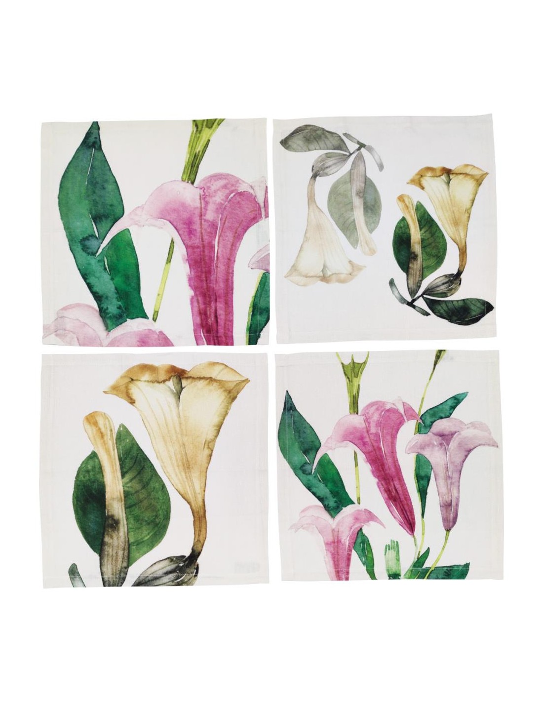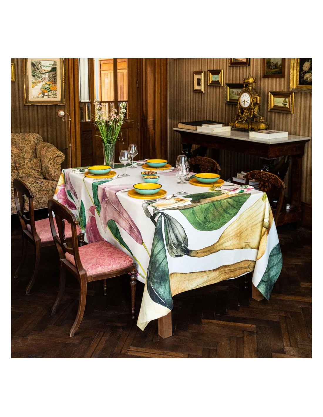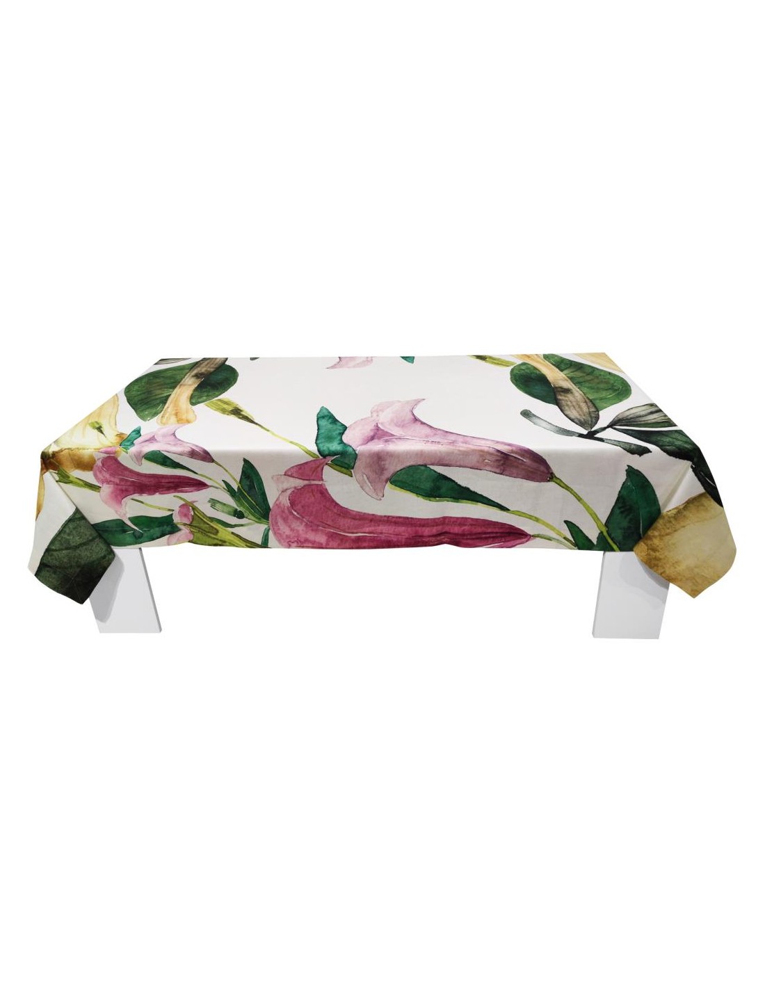 Tovaglia rettangolare da 12 posti con tovaglioli, in puro lino con pregiata stampa digitale fantasia floreale.