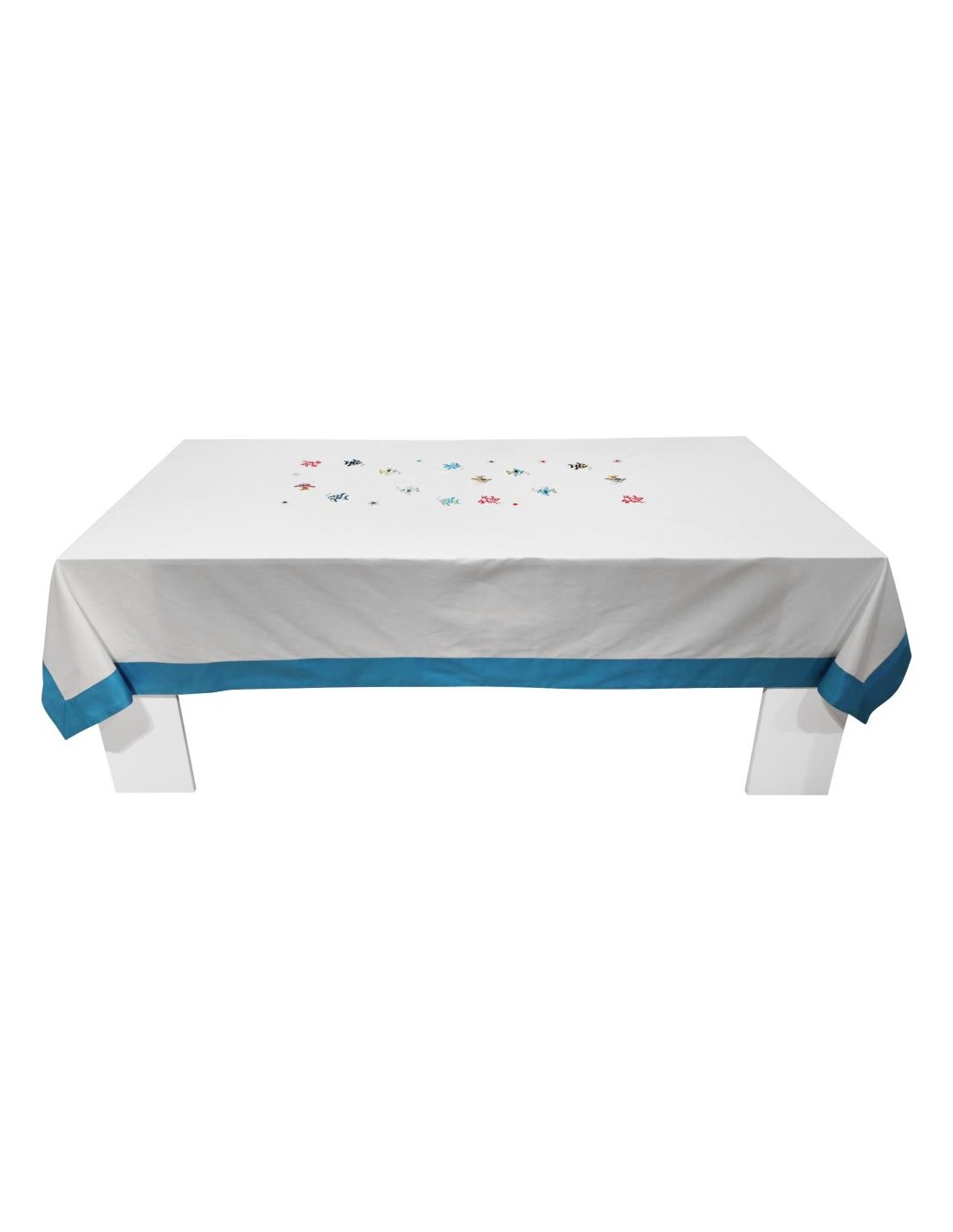 Tovaglia rettangolare da 12 posti in Panama di puro Cotone rifinito con balza, pesci ricamati e tovaglioli.