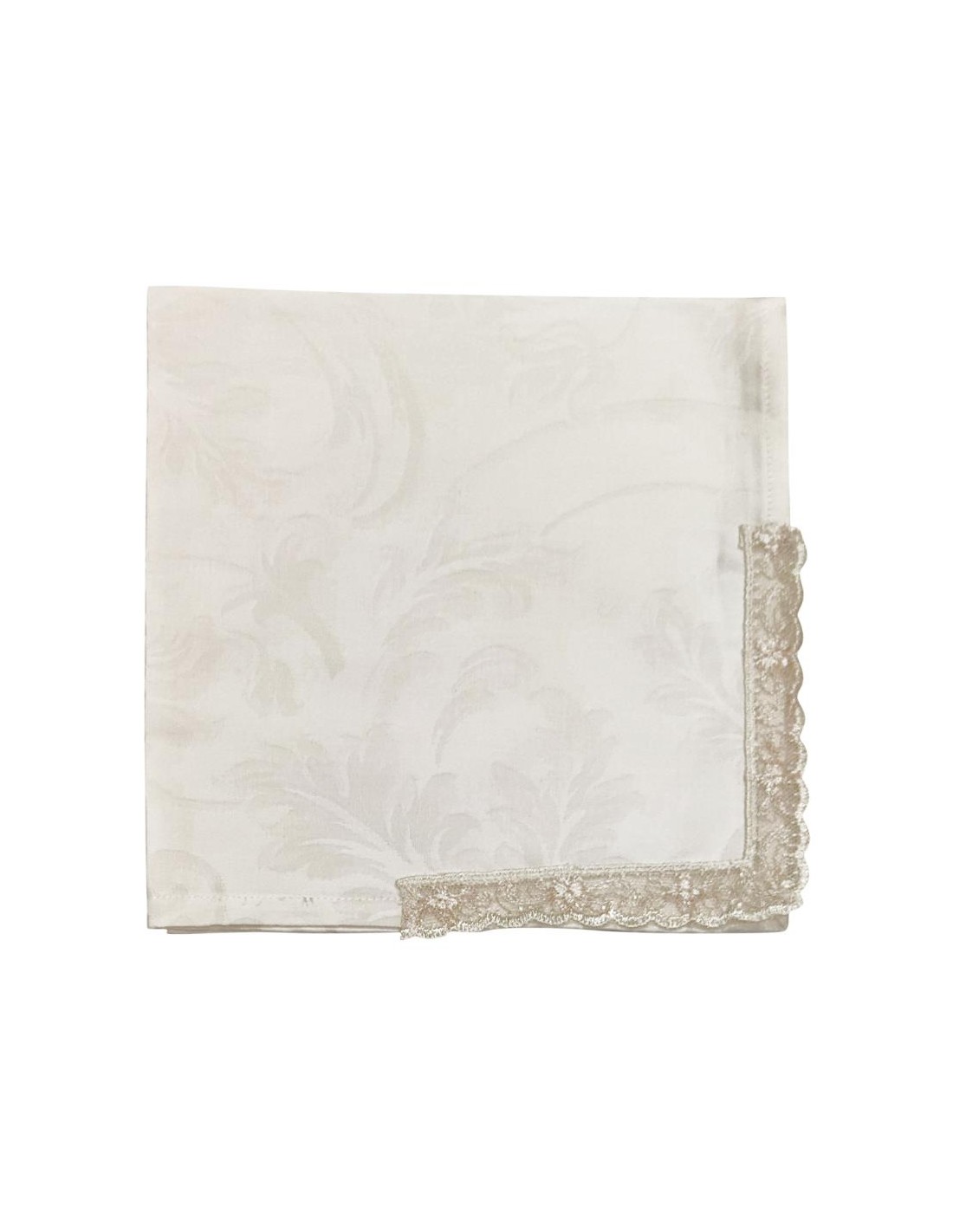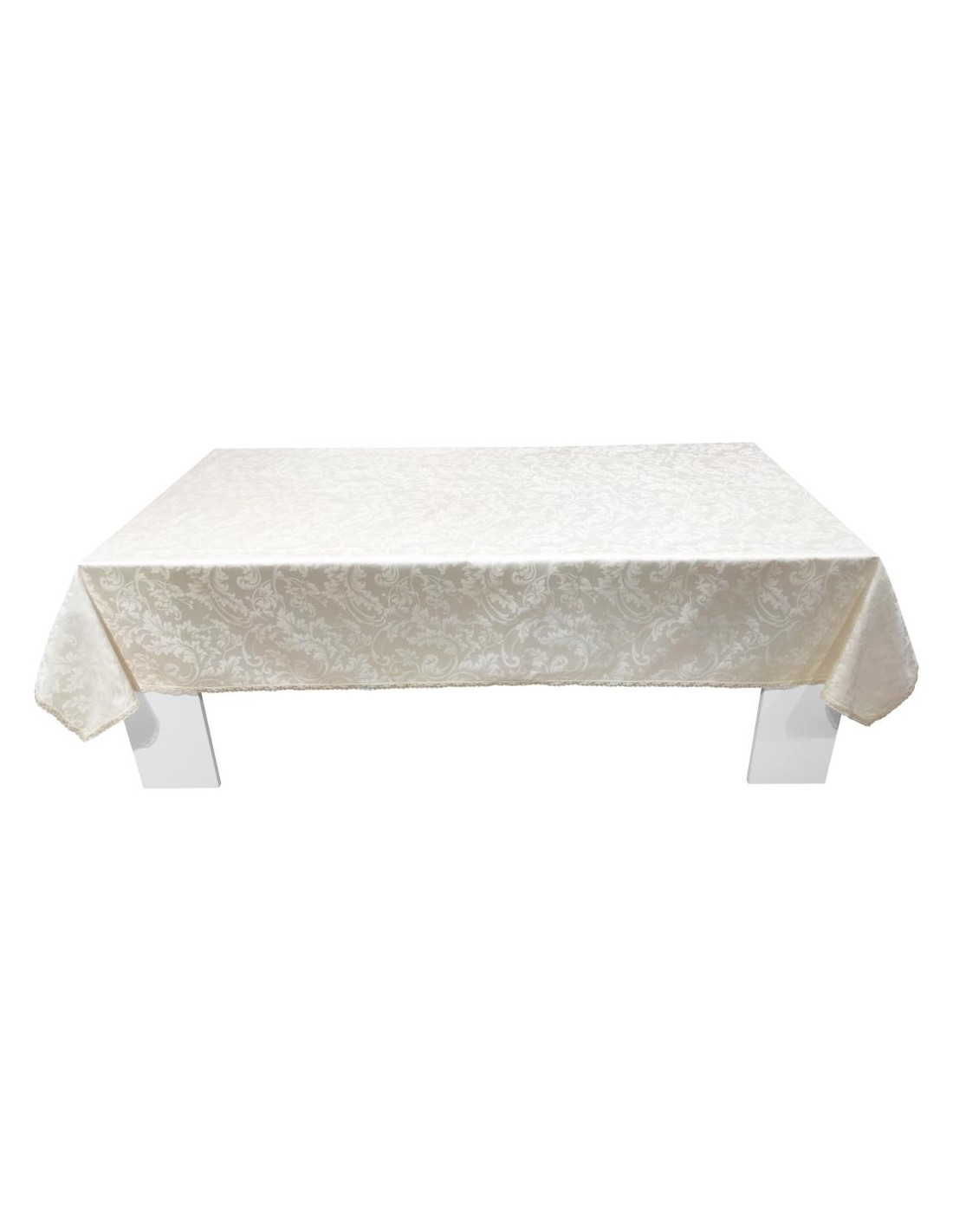 Tovaglia rettangolare da 12 posti, in fiandra di puro cotone fantasia ramage, rifinita con inserti in pizzo rebrodè e tovaglioli.