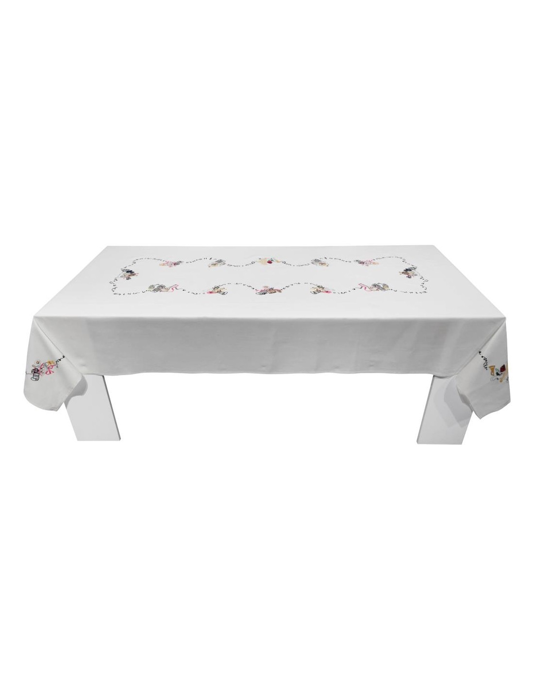 Tovaglia rettangolare da 12 posti con tovaglioli ricamati, in puro lino rifinita con ricamo "Musica" realizzato a mano, ideale per feste e compleanni.
