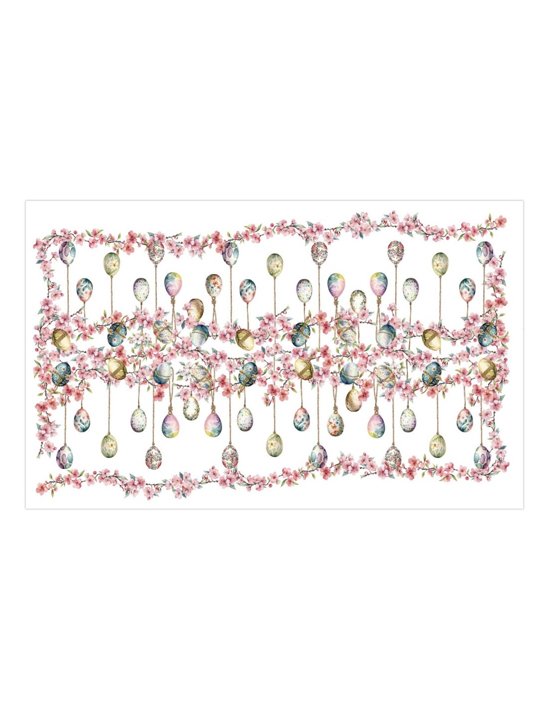 Questa tovaglia presenta un motivo floreale a tutta ampiezza caratterizzato da rami di pesco in fiore che si intrecciano su più livelli. Tra i petali rosa sfumati ad acquerello pendono uova decorate con pattern botanici e geometrici, sostenute da sottili fili di corda. La composizione ritmata e i toni pastello creano un effetto visivo leggero e primaverile, ideale per vestire la tavola durante il periodo pasquale con eleganza e freschezza.