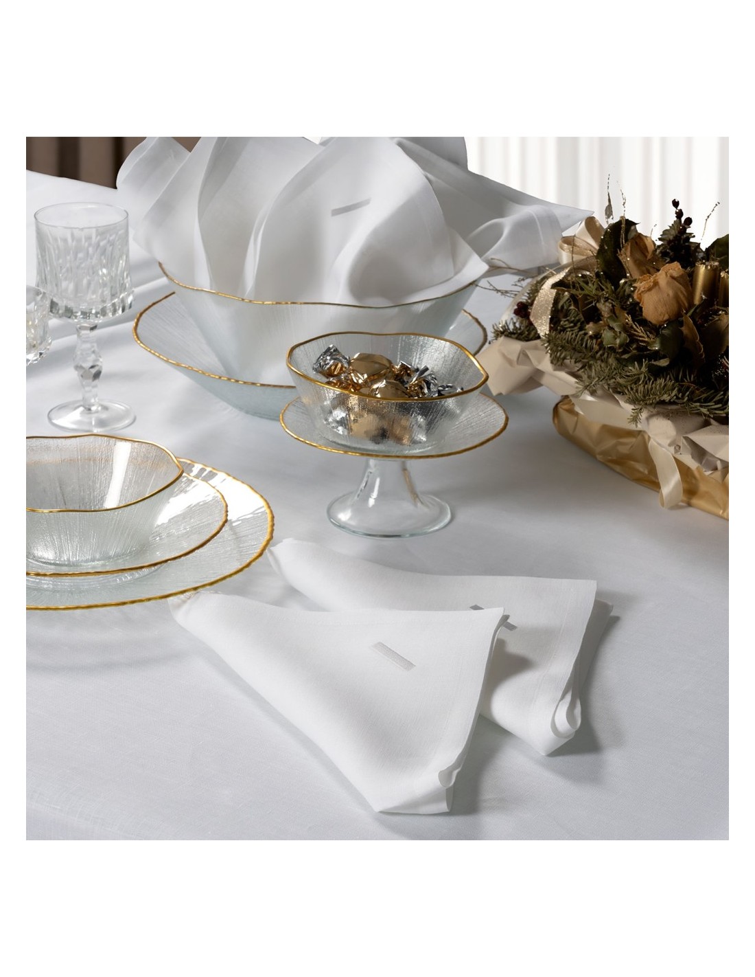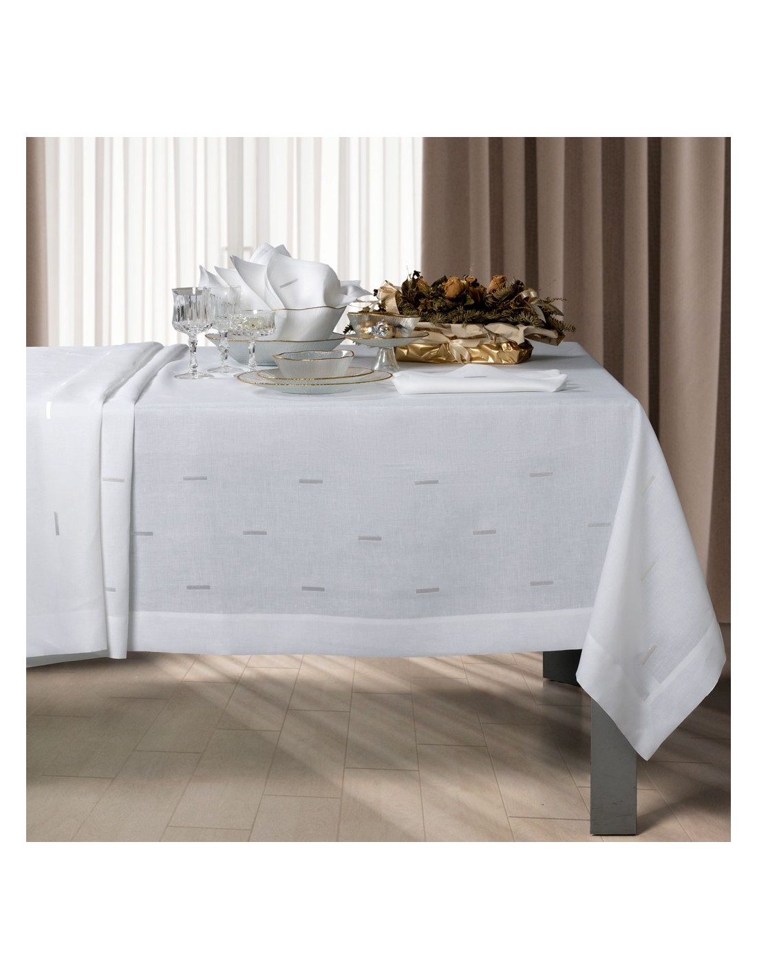 Tovaglia Dea da 12 posti in Panama di puro cotone rifinita con ricami piazzati e 12 tovaglioli ricamati.