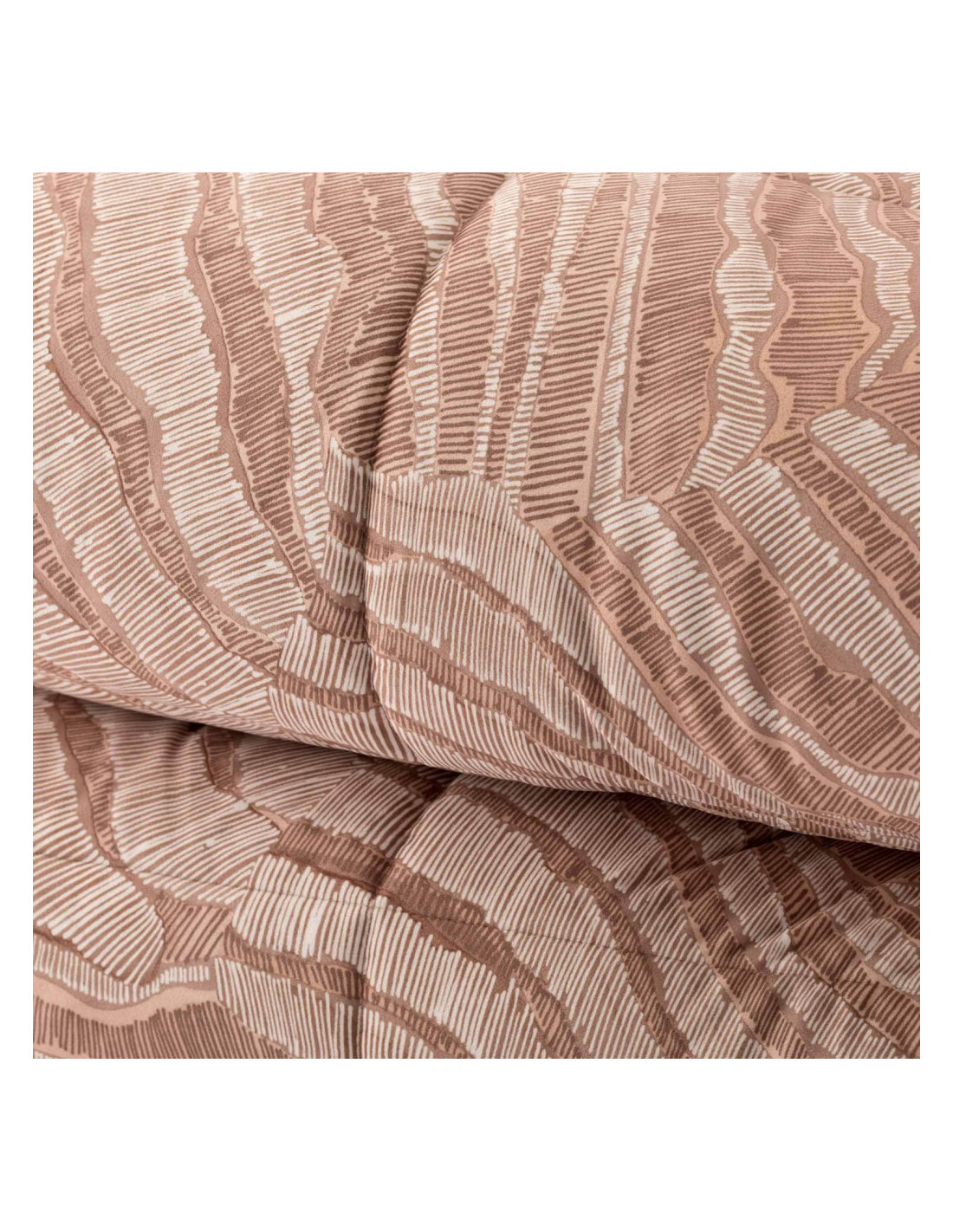 Un disegno che ricorda le venature del legno levigato dal tempo incontra la morbidezza profonda del velluto, caratterizzando la trapunta Cody come elemento d’arredo ricco di personalità. Il suo motivo organico, stampato digitalmente su fondo caramello, evoca la natura in chiave sofisticata, aggiungendo calore e movimento alla camera da letto.