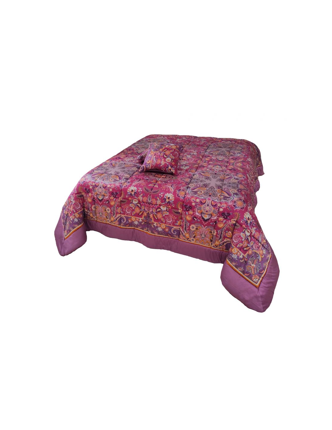 Trapunta matrimoniale Etro in raso di puro cotone, fantasia paisley su fondo fucsia con bordo tinta unita e 2 cuscini arredo rifiniti con cordino.