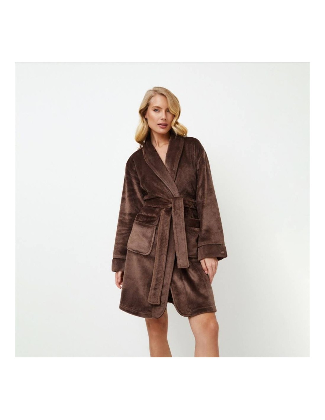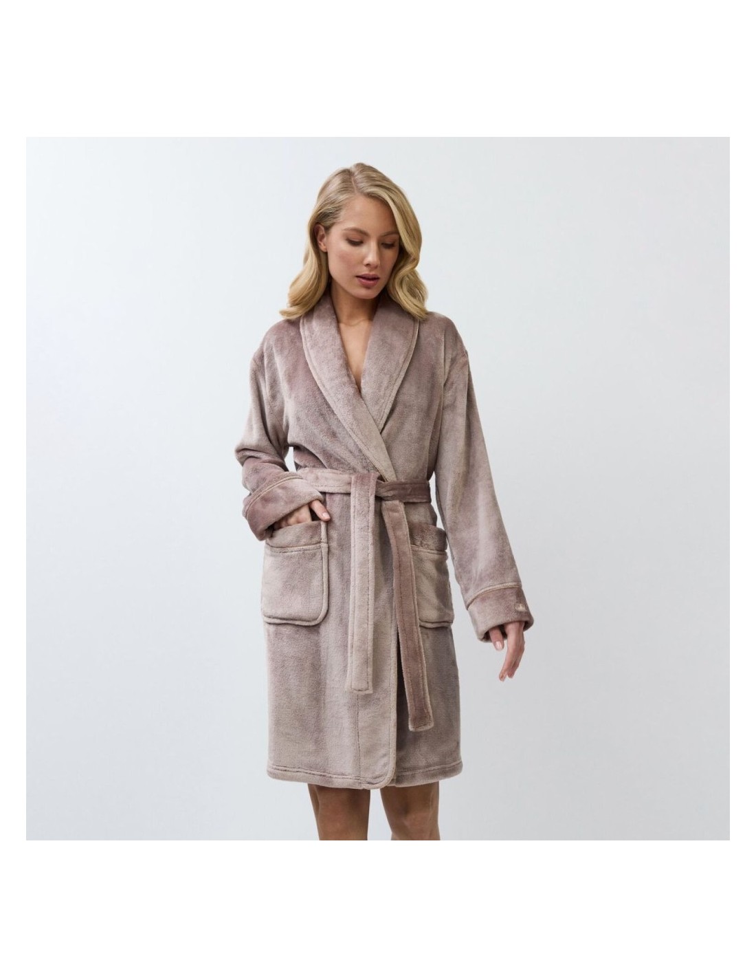 Realizzata in un tessuto di pile eccezionalmente morbido e delicato, la vestaglia ha orlo e tasche arrotondati.